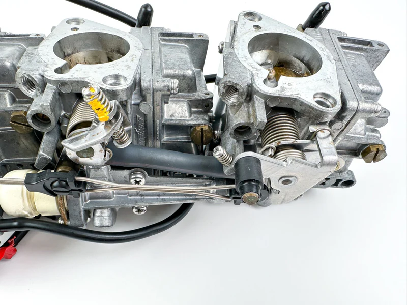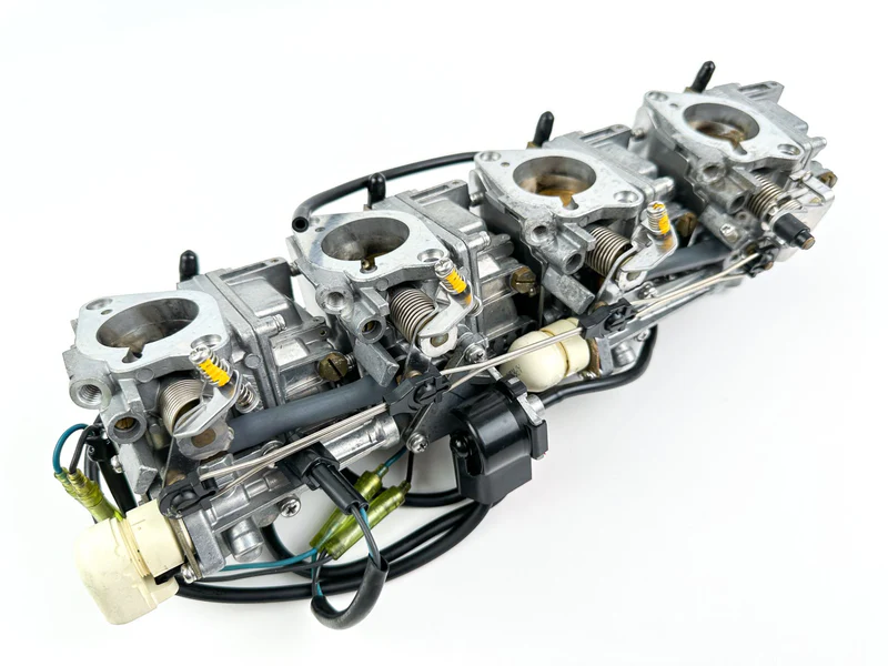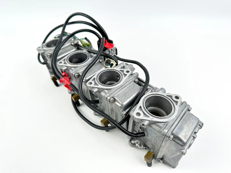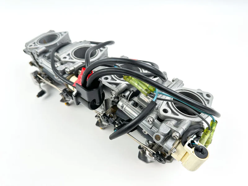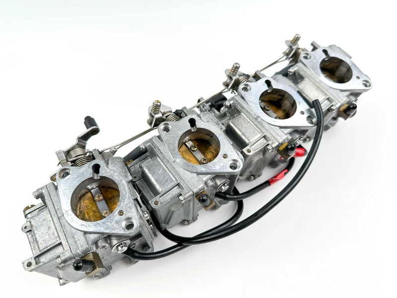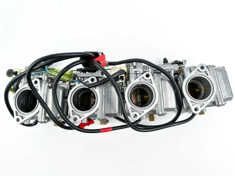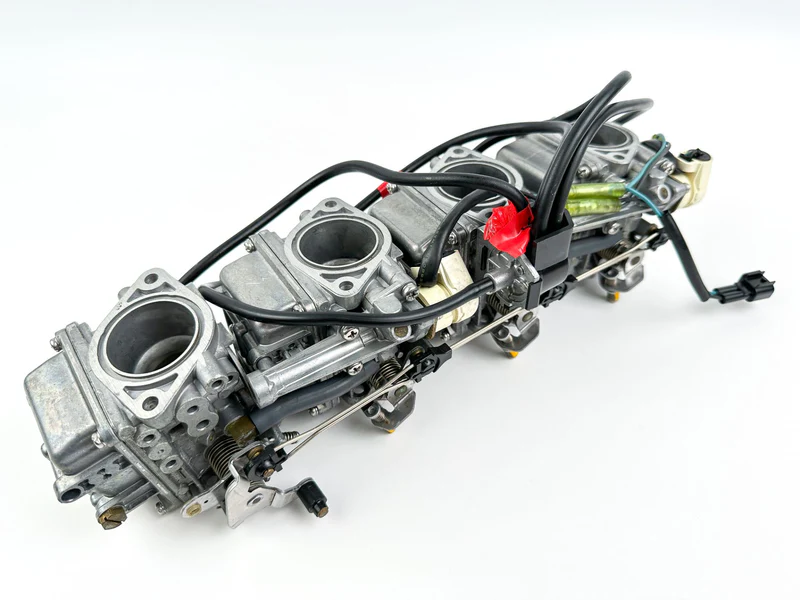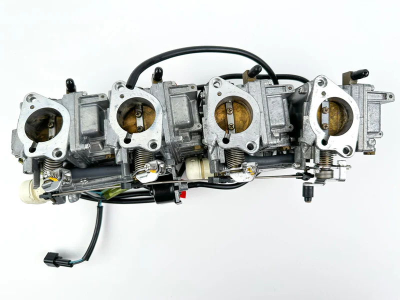 This is a complete set of used Yamaha carburetors with free-moving linkages. The rack comprises individual carburetors (MPNs: 67F-14901-31-00, 67F-14902-31-00, 67F-14903-31-00, 67F-14904-31-00) and is functional but has been in storage. Professional cleaning is required before installation to remove varnish and ensure optimal performance.