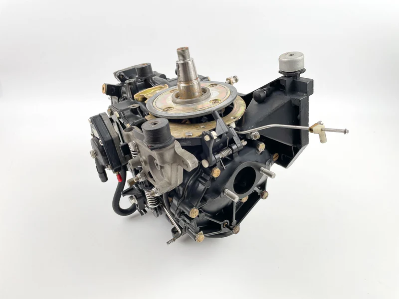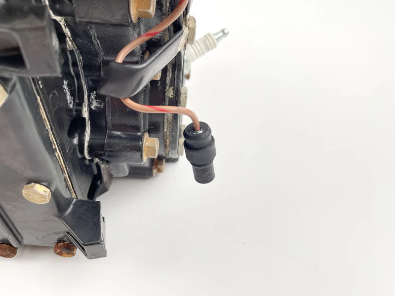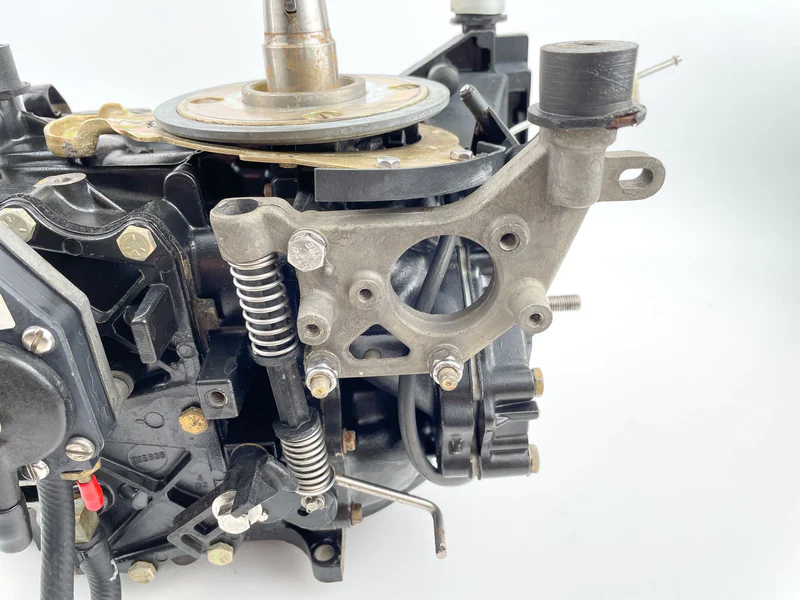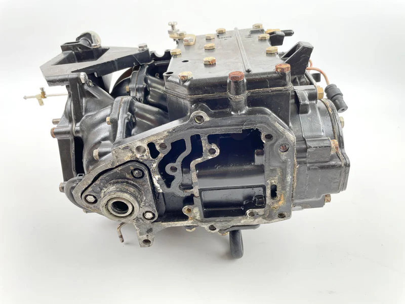This used 2-cylinder outboard powerhead is in good mechanical condition, featuring consistent and even compression across both cylinders. The solid, uniform readings indicate a reliable engine core suitable for rebuild or as a functional replacement.